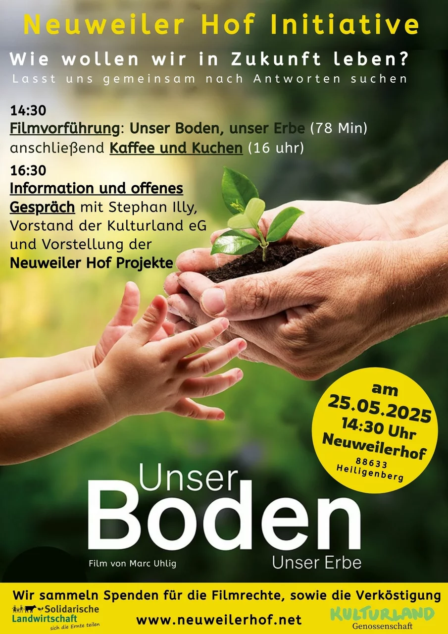Am 25.5. um 14:30 Uhr organisiert die Neuweiler Hof Initiative einen Info-Nachmittag mit der Filmvorführung "Unser Boden, unser Erbe". Im Anschluss findet ein offenes Gespräch über mögliche Lösungsansätze mit Stephan Illy statt, Vorstand der Kulturland eG, und Georg Hilsenbek, Gründer der Solawi Neuweiler Hof. Für den Film sowie für die Verpflegung sind Spenden willkommen.